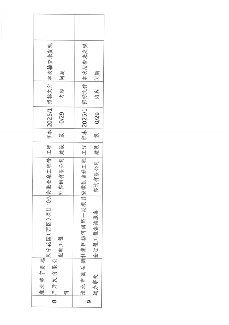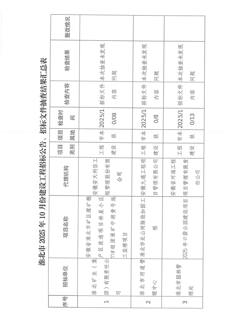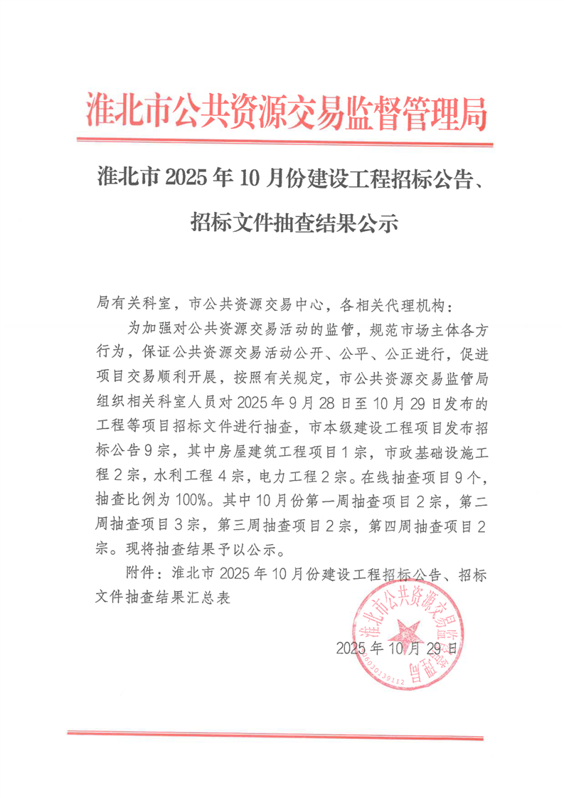 淮北市2025年10月份建设工程“双随机一公开”招标公告、招标文件抽查结果公示