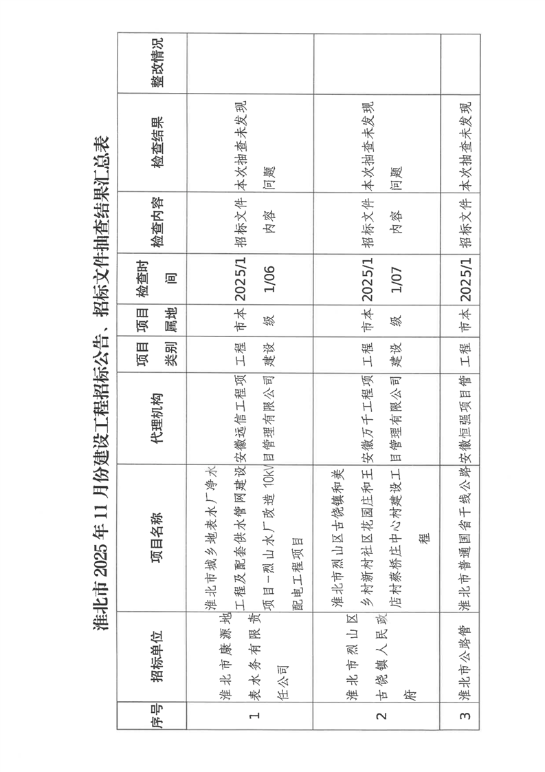 淮北市2025年11月份建设工程招标公告、招标文件抽查结果公示