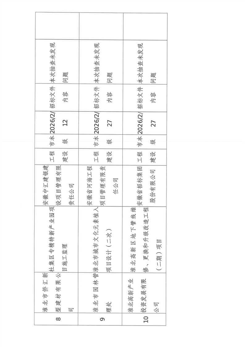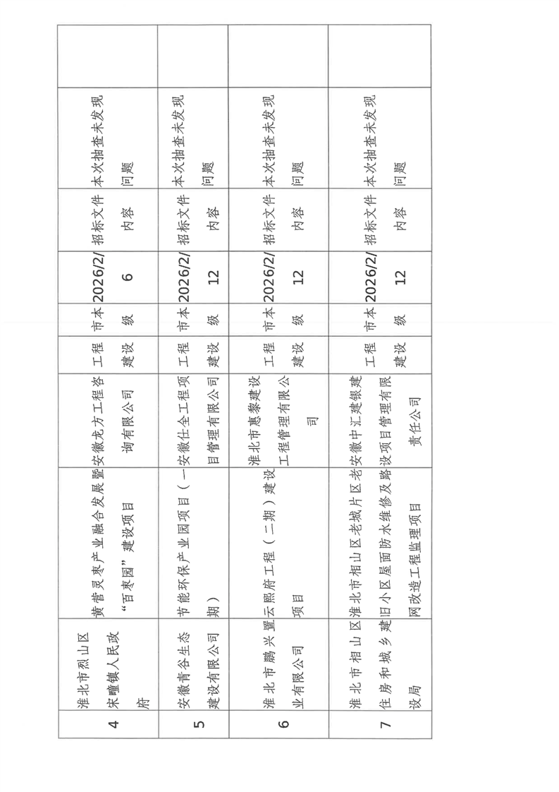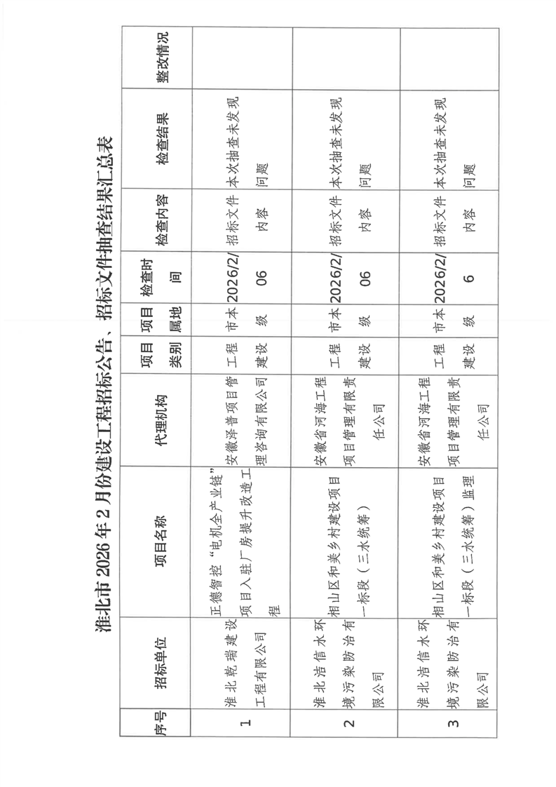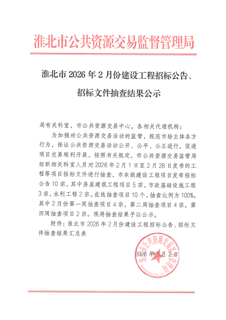 淮北市2026年2月份建设工程招标公告、招标文件抽查结果公示