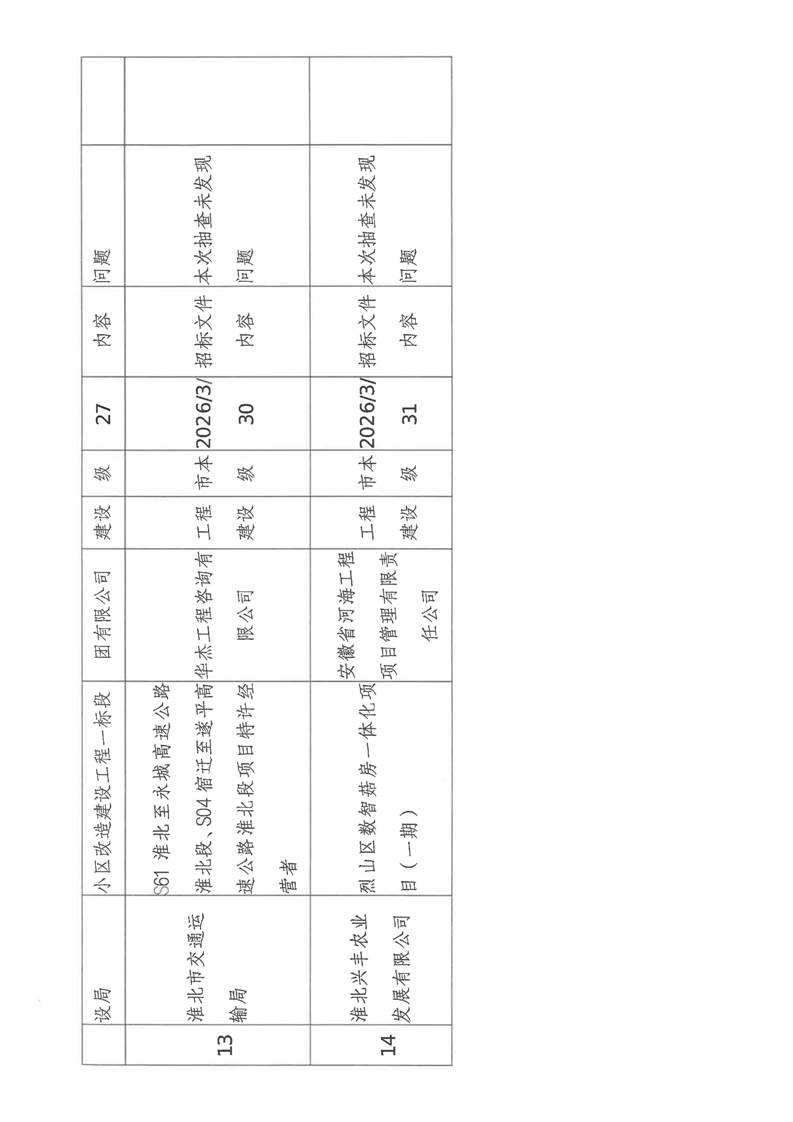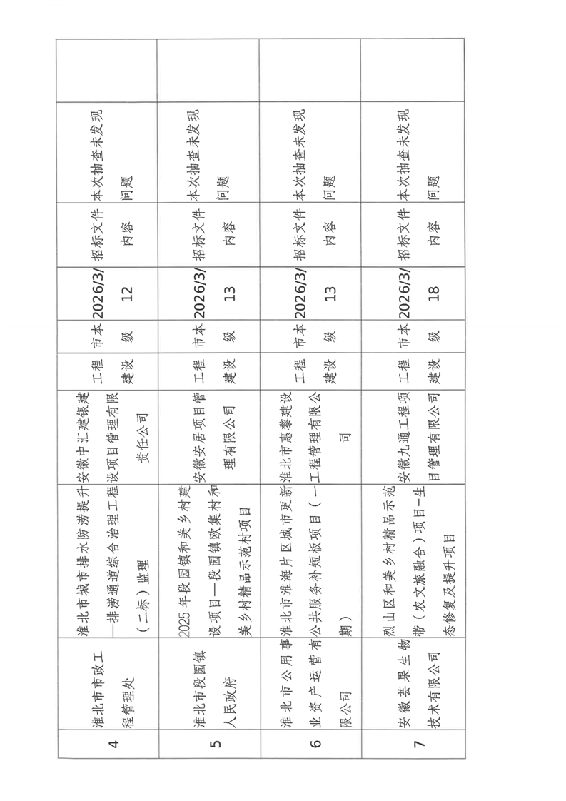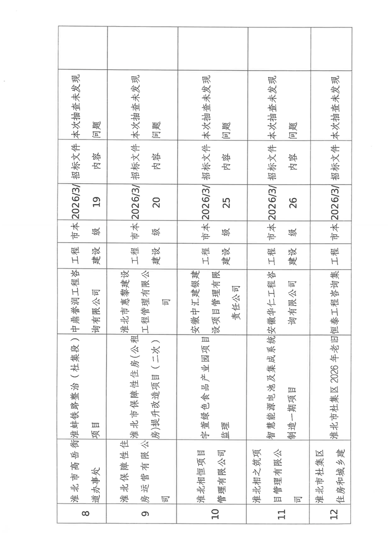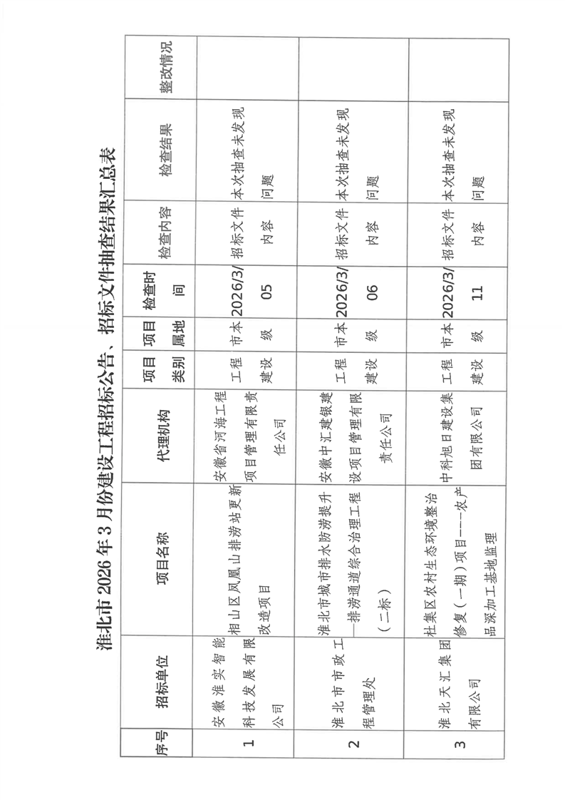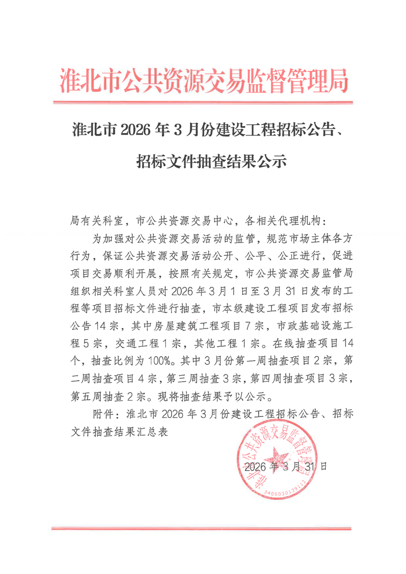 淮北市2026年3月份建设工程招标公告、招标文件抽查结果公示